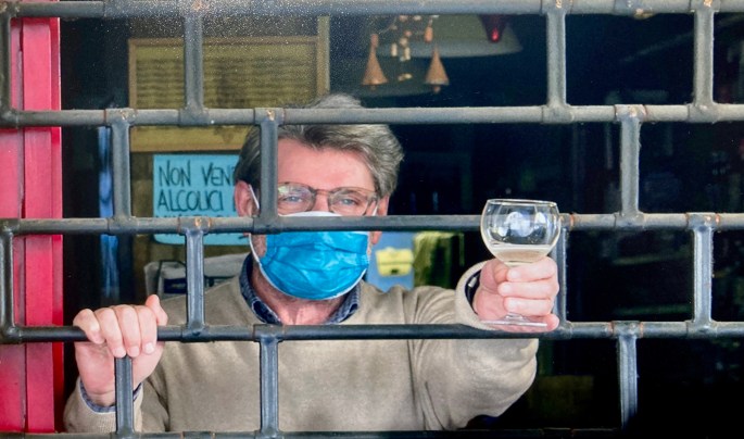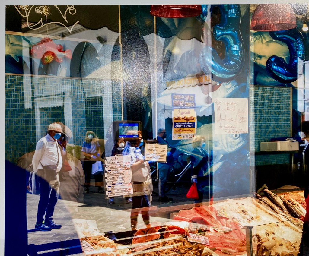 The Galleria Civica Cavour exhibition itinerary is circular, meaning that it starts and ends with the entrance. The room is well lit, and the artworks are spaced out, making it easy to read for anyone entering the space, which is also equipped to accommodate people with reduced mobility. The first work, which welcomes the visitor, is one of the most significant in the exhibition. In this shot, a restaurateur is standing behind the lowered shutter, raising his glass of white wine in a toast to the photographer, who is documenting this global event. The hallmark of a person who is trying to maintain a daily routine and who has not yet thrown in the towel, even in an extreme emergency situation due to a global pandemic.