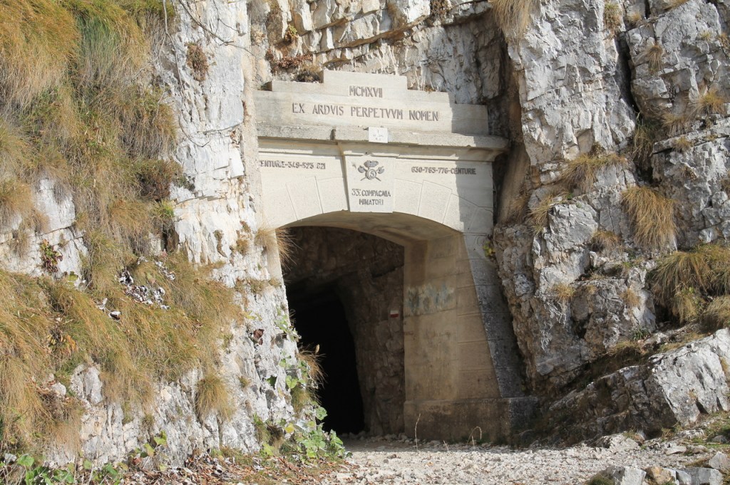 The “Strada Delle 52 Gallerie” (Road of the 52 Tunnels) was built during the Great War (WWI) to allow the Italian troops to communicate and resupply their defensive line, sheltered from the sight and the offensive of the enemy in any season and down any weather. The first line, located on the summit of Pasubio, had the arduous task of preventing the advance of the Austrian army attacking from the valley, and could also be supplied by the Scarubbi roadway, which could also be traveled by lorries, but only in the summer season and at night, as it was exposed to the sight of the Austrian artillery observers stationed on the mountains.