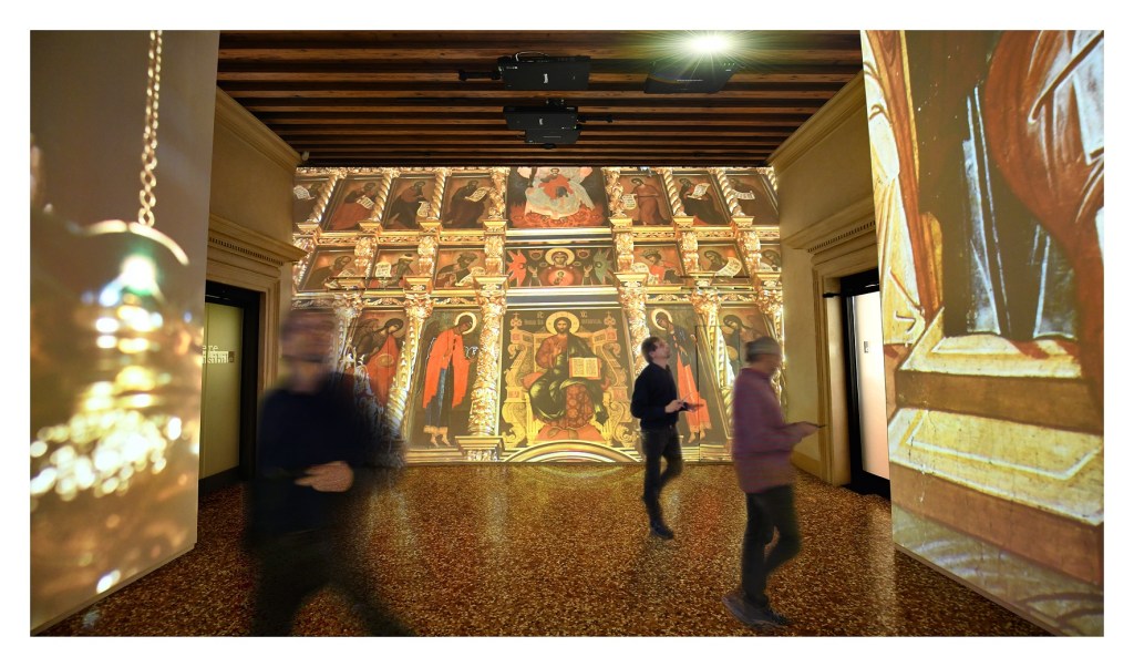 La prima sala del percorso espositivo, immersiva e multisensoriale, è un ambiente narrativo che avvia un dialogo tra la millenaria civiltà russa della raffigurazione del sacro e un aggiornato “sguardo occidentale”, rispettoso e rigoroso nei confronti di quella tradizione e insieme impegnato a fornire al visitatore adeguate e stimolanti chiavi di lettura indispensabili per intenderla. La sala accoglie i visitatori all’inizio del loro viaggio visivo nella spiritualità russo-ortodossa e consente loro di percepire lo spazio in cui sono fruite davvero le icone: se per l’Occidente l’icona è semplicemente un artefatto realizzato in un particolare periodo storico, in Russia è invece un organismo sempre vivo. L’icona è parola per immagini, atto di preghiera e strumento liturgico: non è un oggetto da osservare (e ammirare), ma il segno vivente in una dimensione di devozione e contemplazione. Prodotto dallo Studio Arts Media di Mosca, con la regia di Nikita Tichonov, il video ci immerge nell’intensità dei riti della chiesa dell’Annunciazione della Santissima Madre di Dio, nel villaggio di Pavlovskaja Sloboda, nella Regione di Mosca.