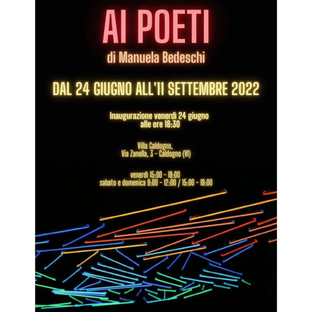 Villa Caldogno accoglie il percorso creativo di Manuela Bedeschi: pitture, installazioni, opere luminose, carte colorate, tra il piano nobile ed il seminterrato della magnifica villa veneta. La mostra supera il limite delle opere al fine di coinvolgere ogni possibilità creativa del passato e del presente di Bedeschi, per riassumere nel titolo di dedica “AI POETI” l’intera sua poetica. Le opere assorbono l’emozione estetica del cromatismo delle pareti affrescate ed espandono il clima della vastità dello spazio architettonico; lo